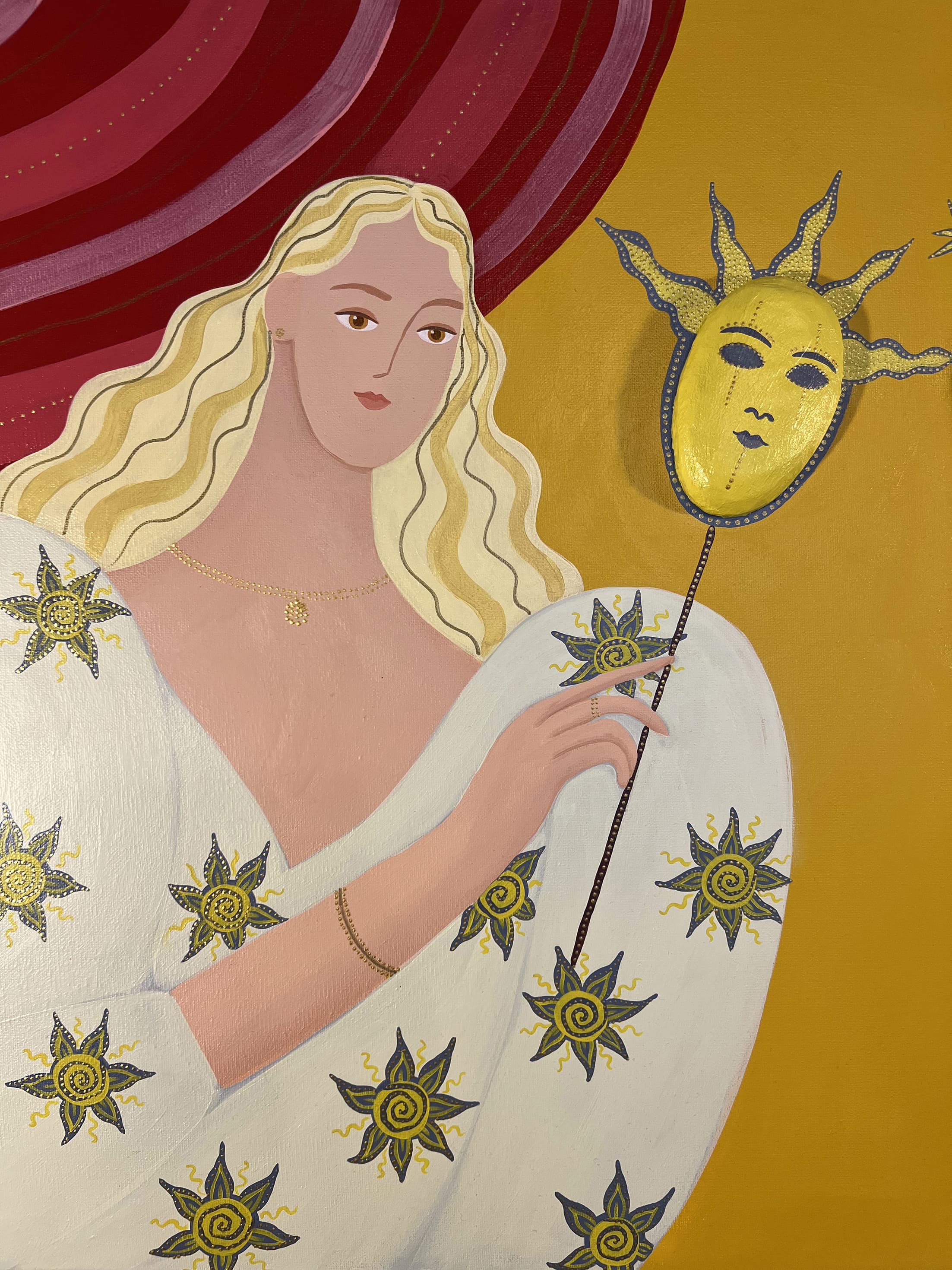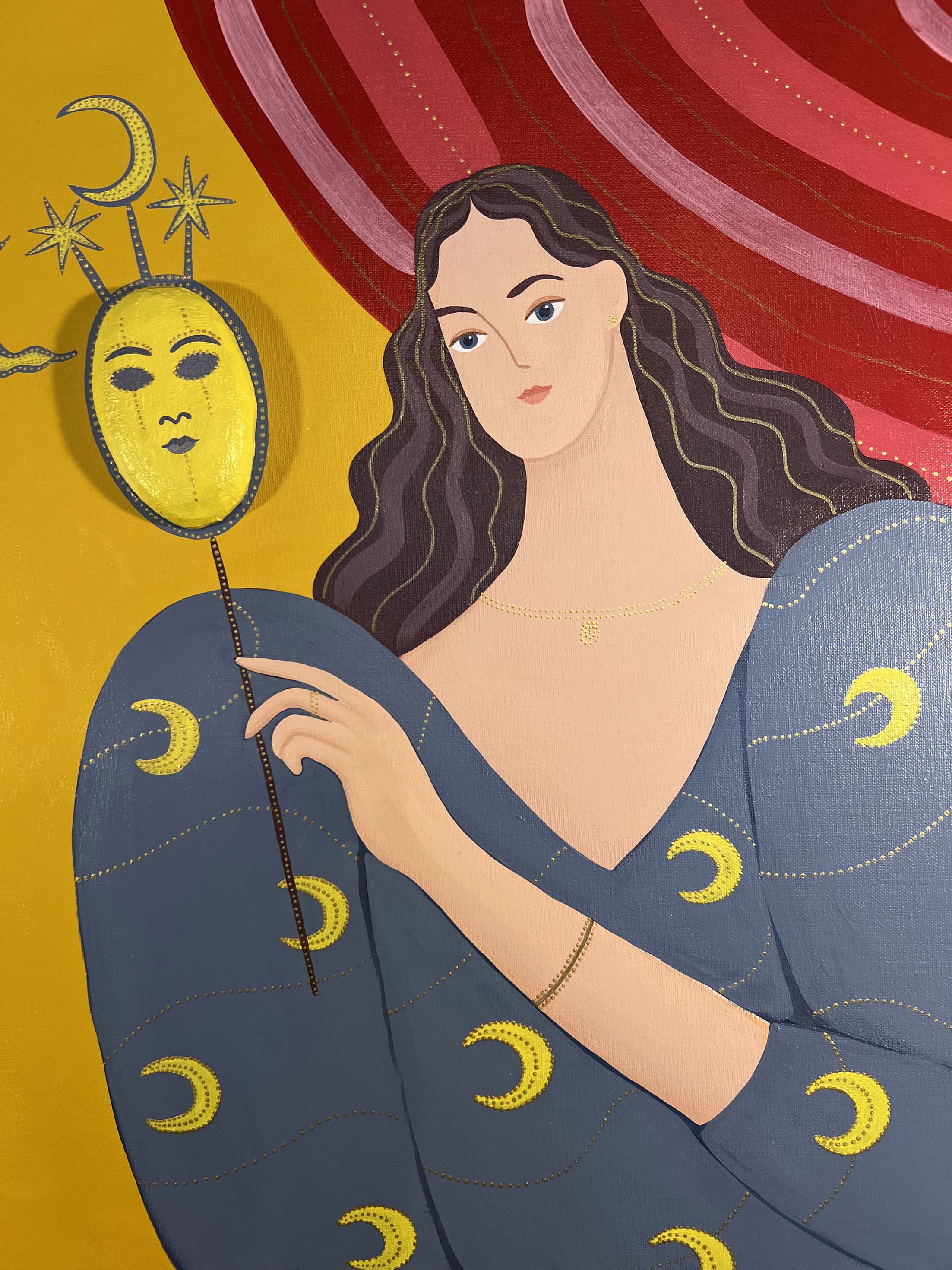 Размер: 60*60 см, диаметр зеркала - 20 см Материалы: фанера, акриловые краски, золотой контур Оформление: круглый артборд из фанеры Год создания: 2025 г.